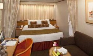 位于甲板中前段;两张标准床,可合并成一张大床,淋浴,客舱设施包括:具有高级欧亚床垫和细棉布床单的豪华床,100%埃及棉豪华华夫编织的毛巾和浴袍,高级按摩淋浴喷头,5倍放大镜化妆镜子,吹风机,香皂,润肤液,洗发水,免费新鲜水果,冰箱中的饮料,平板电视和DVD播放机,擦鞋服务,24小时客房服务。
