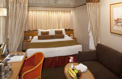 位于甲板前段;两张标准床,不可合并成一张大床,淋浴,具有西利高级欧亚床垫和细棉布床单的豪华床,100%埃及棉豪华华夫编织的毛巾和浴袍,高级按摩淋浴喷头,5倍放大镜化妆镜子,吹风机,香肥皂,润肤液,洗发水,免费新鲜水果,典雅的冰桶和托盘,冰箱中饮料,平板电视和DVD播放机,擦鞋服务,24小时客房服务。