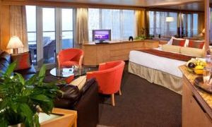 船中;两张单人床可以转换成一张双人大床,带淋浴和浴缸的卫生间,五倍放大化妆镜,更大的衣橱空间,两个洗手池、全套洗浴用品、西利牌欧洲高级床垫、100%高级埃及棉的浴袍、毛巾和床上用品、平板电视、恒温空调、DVD播放机,还有专门配备的意大利咖啡机。