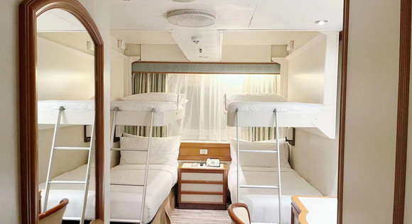 ·设施:位于甲板中前段;衣柜的空间大,带淋浴的私人浴室,有抽屉的办公桌。每个客舱有专属的电视,恒温控制空调,冰箱,个人保险箱,24小时客房服务。 一些客舱都配备了额外的床上用品,以适应第三...