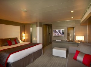 客舱设备设施: ·落地式滑动玻璃门直达私人阳台 ·壁橱空间相当大 ·一个浴缸和淋浴的私人浴室 ·免费咖啡和卡布奇诺、擦鞋服务、 每日新闻报纸、行李的拆装服务 及、提前上下船、每日水果冷盘花卉、根据喜好选择餐桌、手提袋、升级的床和浴缸的功能、如羽绒被和枕头床垫、一个枕头菜单、双厚的Frette浴衣、超大浴巾、法国品牌沐浴露.