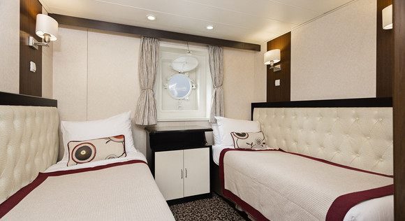 ·设施:标准双人舱包含两张单人床(或一张双人床或一张单人床+一张下拉床),各船舱均有床头柜、电视、衣橱、独立卫浴,一个舷窗。