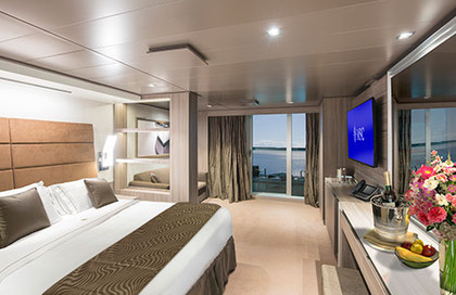 ·设施:甲板上前端.咖啡机.套房配浴缸大浴室.双人床(单人床可转换为大床.或双人床).皮革床头板.床头柜和壁灯.枕头菜单.平板高清电视(互动电视系统.可以预订.还有行程/港口呼叫和旅游/游...