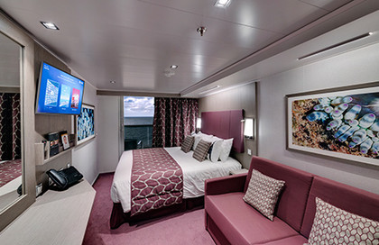 ·设施:双人床(单人床可转换为大床,或双人床),带漩涡浴缸阳台,套房配浴缸大浴室,皮革床头板,床头柜和壁灯,枕头菜单,平板高清电视(互动电视系统,可以预订,还有行程/港口呼叫和旅游/游览信...
