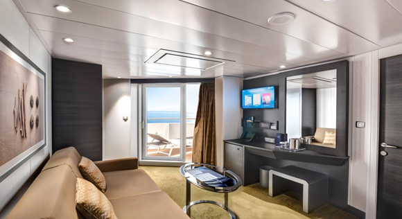 ·设施:• 最多入住人数:4 • 套房配有私人漩涡按摩池的阳台 • 双人舱第一/二人入住为一张双人床或两张单人床;家庭房第三/四人入住为沙发床 • 互动电视,迷你酒吧和吹风机 • 空调、电...
