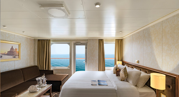 ·设施:配备独立阳台与沙滩椅,每间客舱可容纳2~4名乘客,配有1张双人大床(可拆分成两张单人床)的独立卧室,部分房间配备1~2张伸拉式折叠床;独立卫生间,浴缸,梳妆台,吹风机;配备有液晶电...