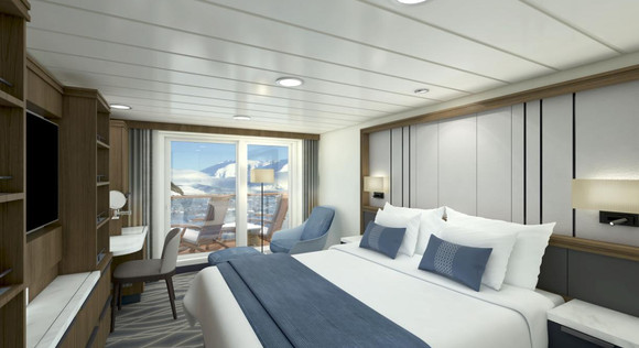 ·设施:客舱内设有1间起居室和1间卧室; 房间内设有1张双人床(或2张单人床)、1张沙发(床); 宽敞的浴室和私人观景阳台+落地窗。