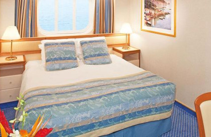 ·设施:位于甲板中前段;一张大床或2张单人床,100%埃及棉床单。方窗,部分房间配有沙发床(以供第三四位客人入住),独立浴室(独立淋浴设备,洗发水、护发素、润肤露、吹风机),衣柜,迷你保险...