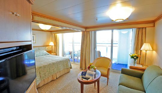 位于甲板后段;舱房宽敞舒适。一张大床或2张单人床,100%埃及棉床单,可选枕头。落地窗,私人阳台,房间面积包含阳台面积。独立的起居空间,大理石装饰的玄关、沙发床(以供第三位客人入住)、步入式衣帽间、独立浴室(独立淋浴设备、浴缸、浴袍、浴盐、舒缓凝胶眼膜、吹风机),迷你酒吧,CD/DVD播放器,迷你保险箱,平板电视,冰箱,写字桌,咖啡桌,电话等。位于船尾,美丽海景一览无余。可优先登离邮轮,优先离开港口,享有离船休息室;优先预定岸上游与餐厅,享有顾客服务VIP通道;免费的私人甲板摄影师、当日洗衣与专业清洁服务、擦鞋服务,提供雨伞。