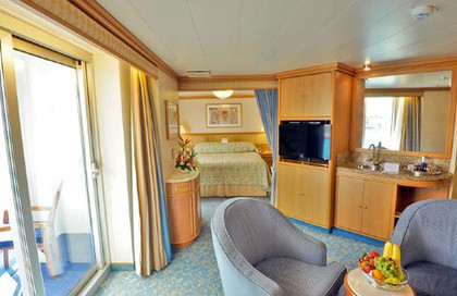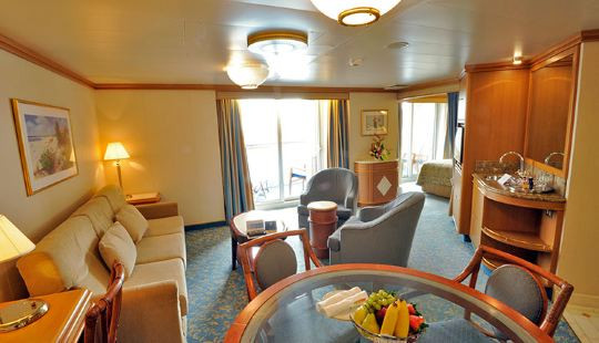 位于甲板后段;舱房宽敞舒适。一张大床或2张单人床,100%埃及棉床单,可选枕头。落地窗,私人阳台(柚木装饰,两把躺椅、两把扶手椅),房间面积包含阳台面积。独立的起居空间,大理石装饰的玄关、沙发床(以供第三四位客人入住)、步入式衣帽间、独立浴室(独立淋浴设备、浴缸、浴袍、浴盐、舒缓凝胶眼膜、吹风机),迷你酒吧,CD/DVD播放器,迷你保险箱,平板电视,冰箱,写字桌,咖啡桌,电话等。位于船尾,美丽海景一览无余。可优先登离邮轮,优先离开港口,享有离船休息室;优先预定岸上游与餐厅,享有顾客服务VIP通道;免费的私人甲板摄影师、当日洗衣与专业清洁服务、擦鞋服务,提供雨伞。
