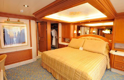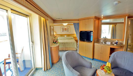 ·设施:位于甲板前段;舱房宽敞舒适。一张大床或2张单人床,100%埃及棉床单,可选枕头。落地窗,阳台(海上巡游日与夜晚的阳台访问可能被限制),房间面积包含阳台面积。独立的起居空间,大理石装...