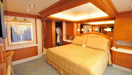 位于甲板后段;奢华的舱房宽敞舒适。一张大床或2张单人床,100%埃及棉床单,可选枕头。落地窗,全方位环绕式私人阳台(柚木装饰,两把躺椅、两把扶手椅),房间面积包含阳台面积。独立的起居空间,配备了可供多人聚餐的宽大餐桌。大理石装饰的玄关、沙发床(以供第三四位客人入住)、步入式衣帽间、独立浴室(独立淋浴设备、浴缸、浴袍、浴盐、舒缓凝胶眼膜、吹风机),迷你酒吧,CD/DVD播放器,迷你保险箱,两台平板电视,冰箱,写字桌,咖啡桌,电话,日常客房服务与便利管家服务等。位于船尾,美丽海景一览无余。可优先登离邮轮,优先离开港口,享有离船休息室;优先预定岸上游与餐厅,享有顾客服务VIP通道;免费的私人甲板摄影师、当日洗衣与专业清洁服务、擦鞋服务,提供雨伞。