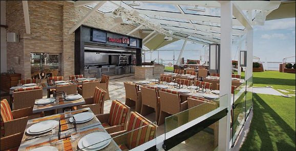这是设立在船上草坪区域的特殊休闲餐厅,您可以选择您所喜欢的肉类食品,并请厨师专门制作,这里也提供一些汉堡及比萨等小吃。 开放时间:下午14:00,晚上17:00-22:00。 着装要求:便装;晚餐则建议正式服装泳衣,短裤和牛仔裤是不允许入内的。 费用情况:收取40美元象征性费用,啤酒,葡萄酒以及软饮料,则按照菜单上的价格。 预约情况:需要预约。15楼船尾。
