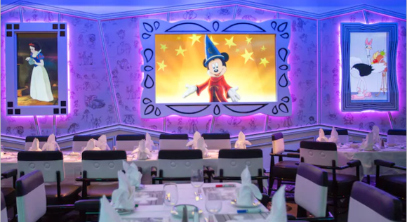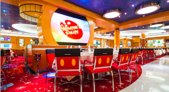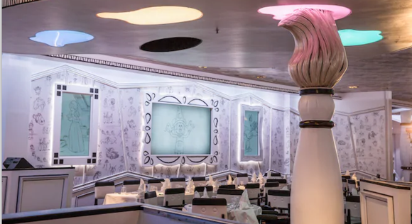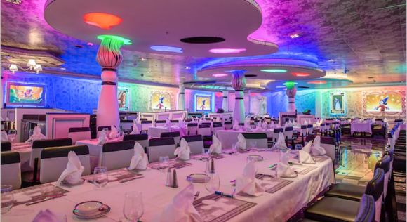 这个主餐厅位于三楼甲板,体验与经典的迪士尼人物在一起用餐的愉悦氛围,每一款色彩令人眼花缭乱的菜肴,在快乐的音乐中,满足您挑剔的味蕾。 开放时间: 早餐:7:30-9:30 午餐:中午-下午2点 晚餐:17:45和20:15。 着装:休闲服,我们建议:3和4晚航次,男性或女性穿着外套。7夜航次,在正式晚宴,穿着正式燕尾服或礼服。 费用:无需付费,但特色饮品及含酒精饮料,按照菜单上的价格另行付费。 预约情况:需要预定。
