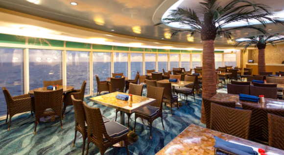 是一个室内和室外自助餐厅,位于甲板十一楼,供应美国和国际经典菜肴。在早餐和午餐,这里提供自助餐;晚餐时是一个休闲而优雅的餐厅,供应更多特色菜肴。 开放时间: 早餐:6:30-10:00 午餐:中午-下午2时 晚餐:17:30- 20:00 着装:休闲着装。 费用:免费,但特色饮品及含酒精饮料需另外付费。 预约:无需预约。