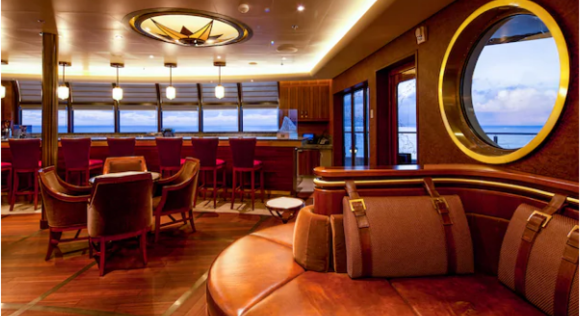 提供壮观的海景座位。受到海上旅行早期的启发,休息室的装饰以嵌入地板的六分仪导航工具为特色,而来自世界各地的护照印章的皮革地图装饰在墙壁上,星星地图上点缀着闪烁的天体标记。