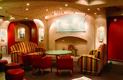 中央摆放着钢琴的小休息厅,周围环绕着座位区和吧台。海上钢琴师伴奏,明快的装修和布置,悠闲地品尝美酒。