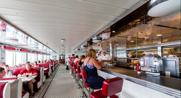 尊尼火箭餐厅。 位于第12层船尾的尊尼火箭餐厅是来自美国50年代的经典餐厅,提供美味多汁的汉堡、浓纯的奶昔和苹果派!餐厅里不仅可以点歌,服务生还会载歌载舞的为您端上美食!具体开放时间和资费情况以船上实际安排为准