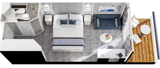 (3)邮轮公司默认床型为大床,所有房间均可拆分成两张单人床。如您需两张单人床,上船后请联系您的客房服务员操作分床。