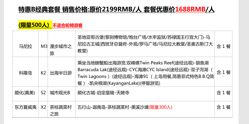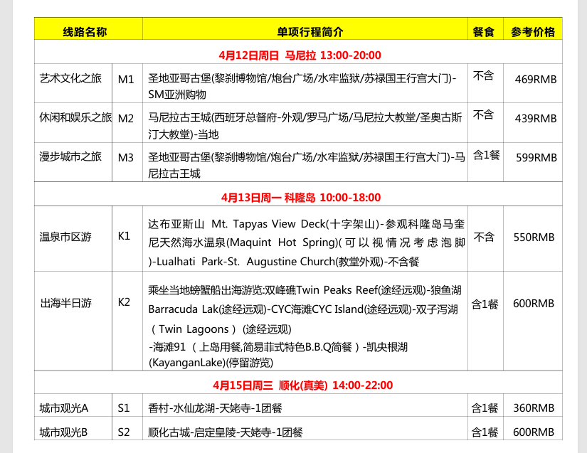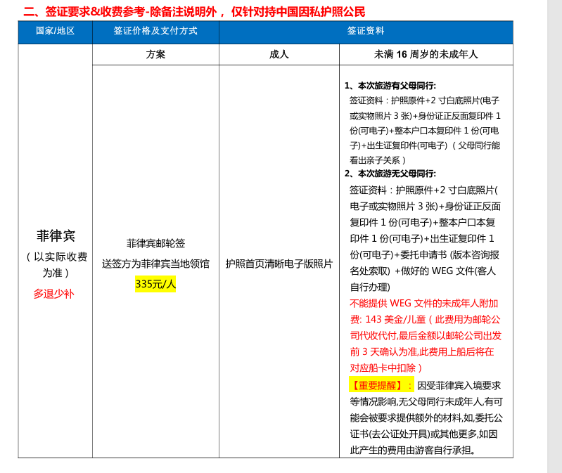 | 【重要提醒】:因受菲律宾入境要求等情况影响,无父母同行未成年人,有可能会被要求提供额外的材料,如,委托公证书(去公证处开具)或其他更多,如因此产生的费用由游客自行承担 | ||||