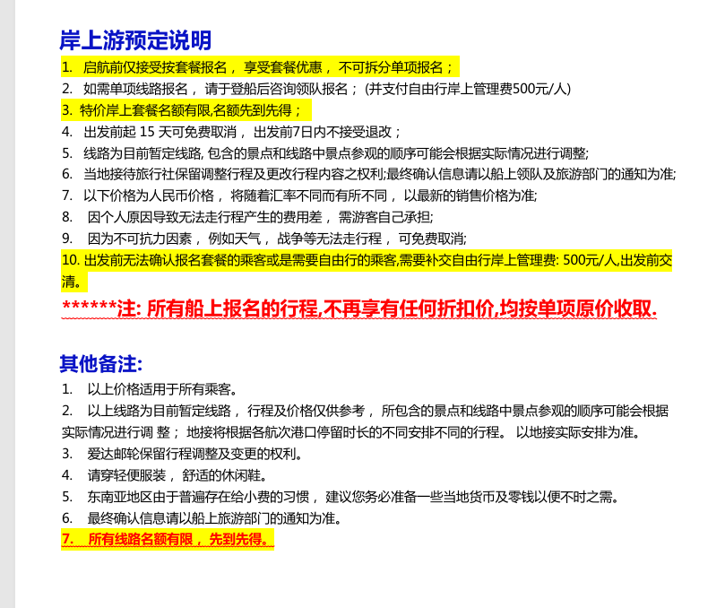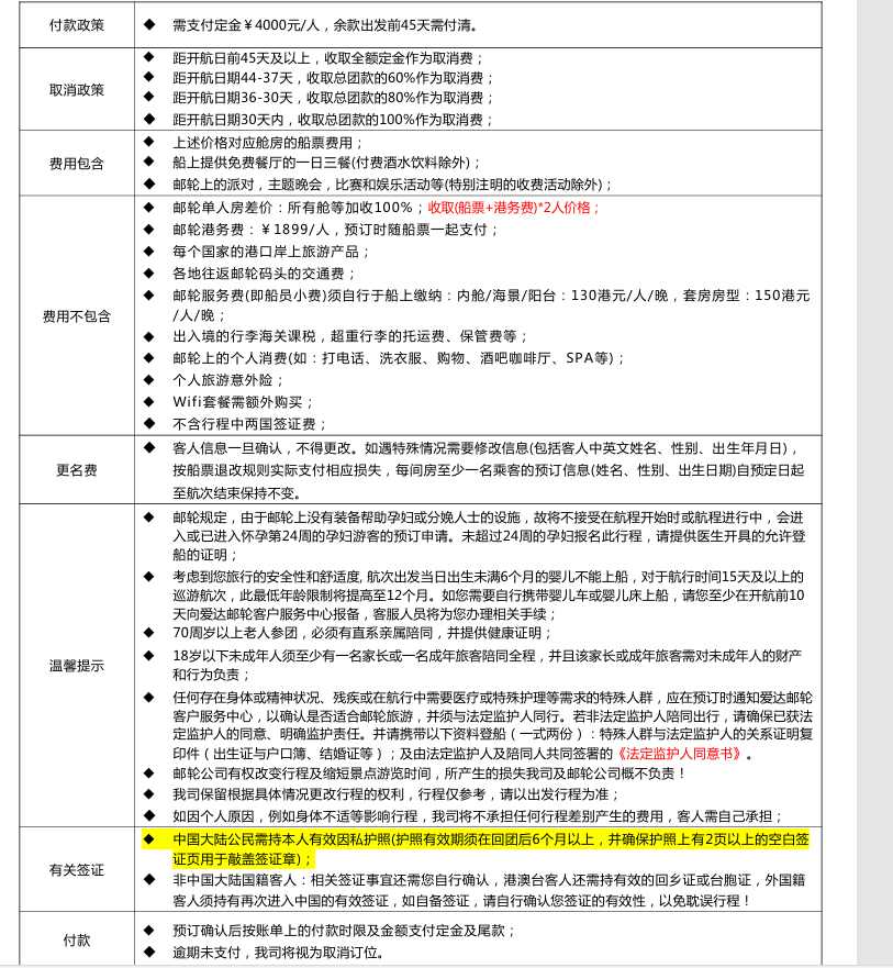 2、邮轮港务费:¥1899元/人,预订时随船票一起支付;