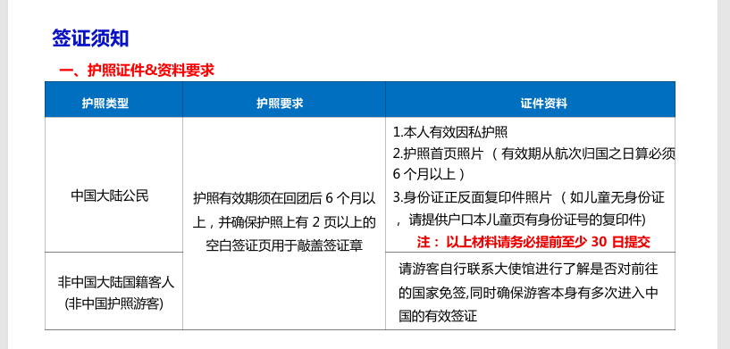 | 中国大陆公民 | 护照有效期须在回团后6个月以上,并确保护照上有2页以上的空白签证页用于敲盖签证章。 | 1.本人有效因私护照2.护照首页照片(有效期从出发之日算必须 6 个月以上)3.身份证正反面复印件照片(如儿童无身份证,请提供户口本儿童页有身份证 号的复印件)注 :以上材料请务必提前至少 30 日提交 |