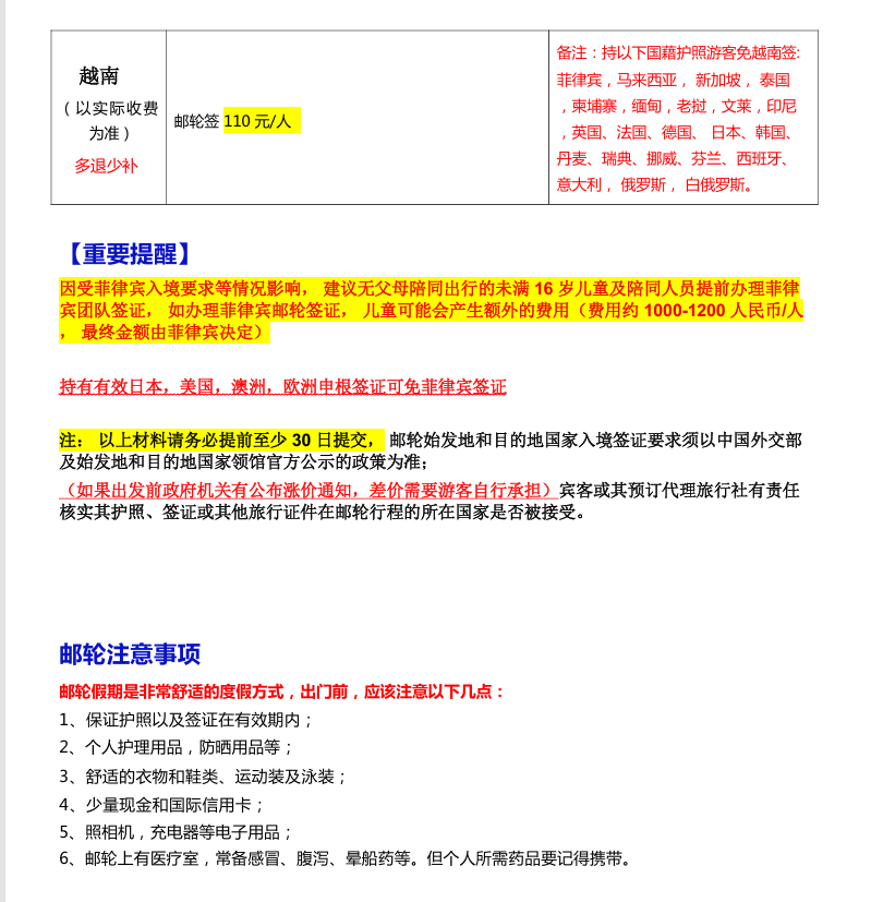 | 越南 | 邮轮签 110 元/人 | 持以下国藉护照游客免越南签: 菲律宾 ,马来西亚 ,新加坡 ,泰国, 柬埔寨,缅甸,老挝,文莱,印尼, 英国、法国、德国、 日本、韩国、 丹麦、瑞典、挪威、芬兰、西班牙、 意大利 ,俄罗斯 ,白俄罗斯 | ||
