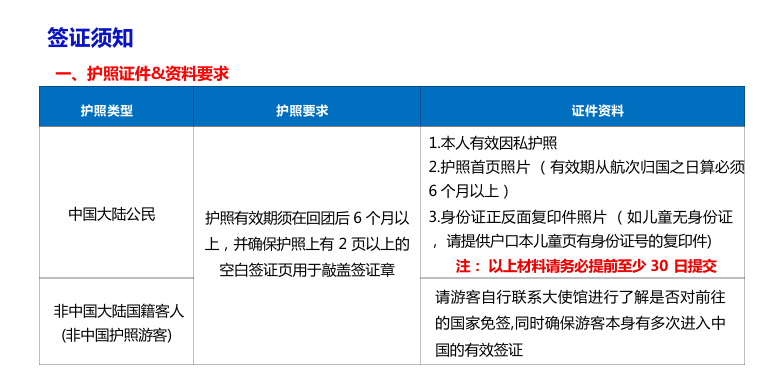 中国大陆公民需持本人有效因私护照(护照有效期须在回团后6个月以上,并确保护