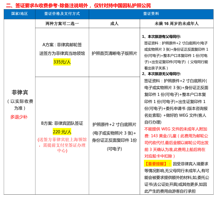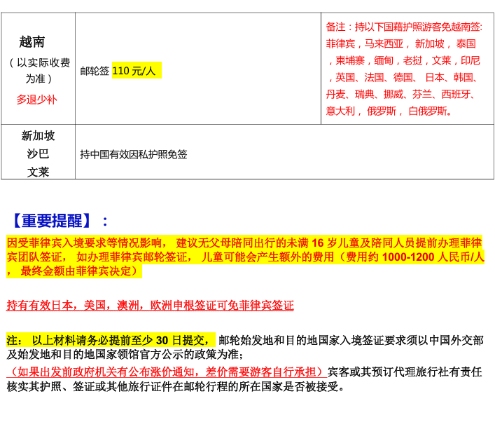 1、护照原件:确保护照有效期在航次结束后仍有6个月以上有效期,否则将无法获取登船凭证,导致Z终不能登船。如因护照有效期或其他护照相关问题造成行程受阻,相应损失需自行承担。
